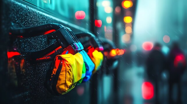 Colorful rain jackets hanging on a bus in a rainy urban setting with blurred pedestrians in the background