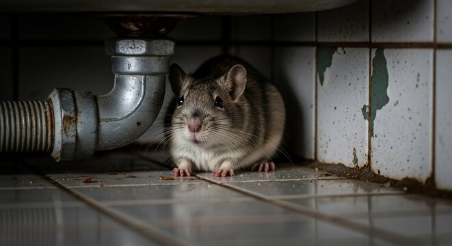An atmospheric scene of a sewer rat standing on a ledge with dim, ambient lighting casting its long shadow on the wet, grimy floor, highlighting the resilience and adaptability of urban wildlife.