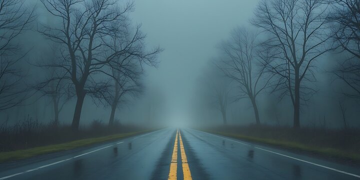 Lonely road stretching into heavy fog through a bare forest, with wet pavement and dramatic mood, symbolizing mystery, solitude, and autumn travel in rural landscapes