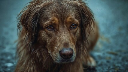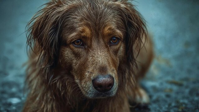 Close up portrait of a wet dog with dirt on its fur looking at the camera