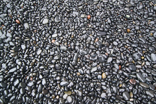 Black-and-white close-up of smooth wet pebbles with droplets of water on their surfaces. Concept Black-and-white photography, macro close-up, wet pebbles, water droplets, smooth stone surfaces