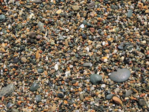Macro coastal gravel and crushed shells texture on sandy shoreline with pebbles