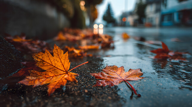Crisp autumn leaves fallen on wet pavement after rain in a tranquil urban scene