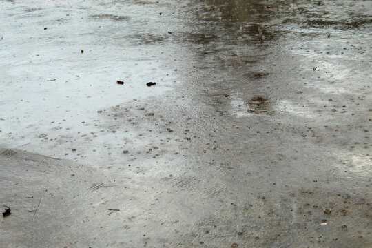 Moody rain puddle with reflection on wet asphalt