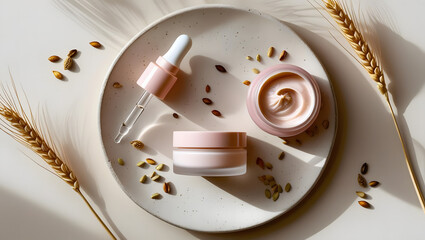 Natural skincare products with wheat and seeds arranged on a plate with soft lighting and shadows
