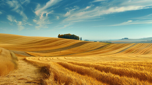 Golden wheat field under a clear blue sky with gentle hills in the background on a sunny afternoon