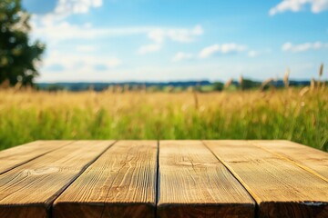 Wooden Table Surface with Wheat Field and Blue Sky Background in Sunny Weather