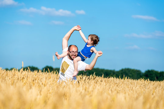 Smiling baby enjoying time with loving father in plaid shirt outdoors in golden wheat field during warm sunset