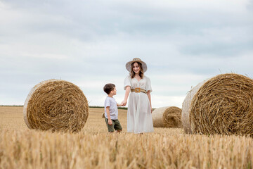 Young mother and son walking near stacks of straw - stacked bales of hay left after harvesting, farm field with harvested crop