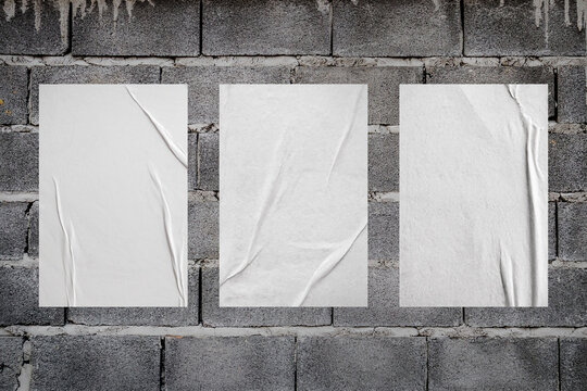 Blank white wheatpaste glued paper poster mockup on concrete wall background