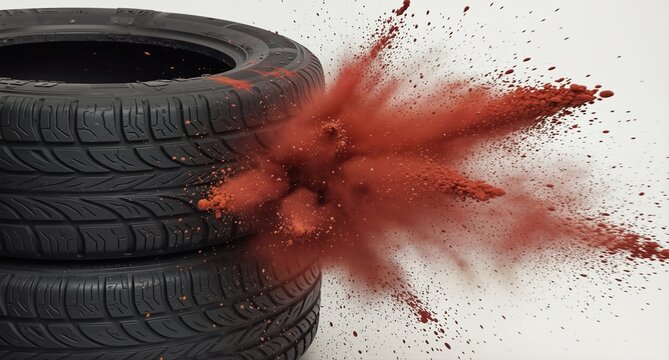 stack of tires with vibrant red powder explosion, dynamic automotive concept