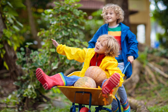 happy, joyful boy, of pre-adolescent age, has fun and laughs riding on a garden wheelbarrow, which is pushed by his mother in backyard garden on a warm sunny day. Active family games in the fresh air