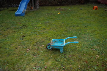 Blue wheelbarrow on a grassy yard with a slide and small stool in the background. Children's play area outdoors.