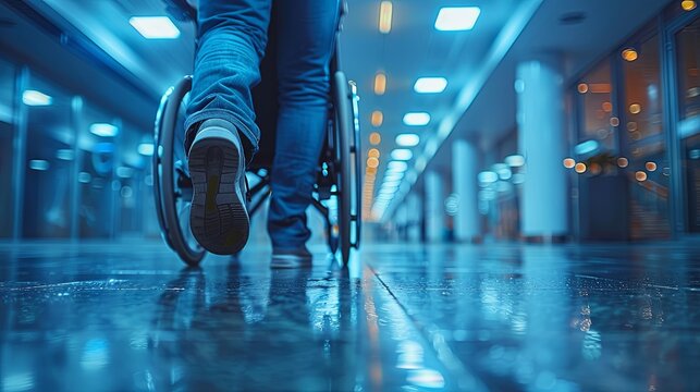 Low-angle shot of a person in a wheelchair moving through a modern hallway with blue lighting.
