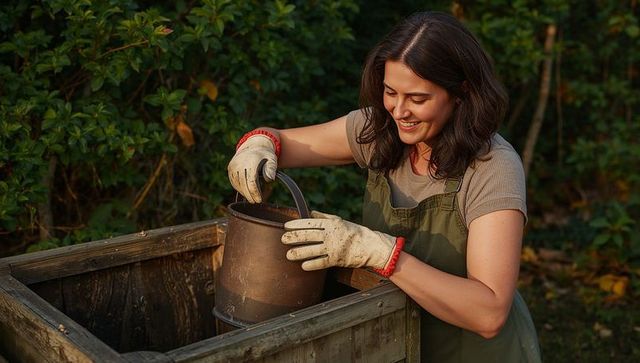Woman gardening with bucket at wooden compost bin in backyard, smiling in overalls and gloves
