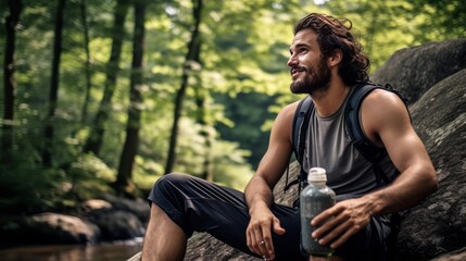The idealize day to be out in nature Shot of a youthful man taking a water break whereas out climbing