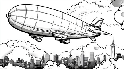 steampunk airship floats above city skyline, surrounded by clouds. This whimsical coloring page invites creativity and imagination for kids and adults alike
