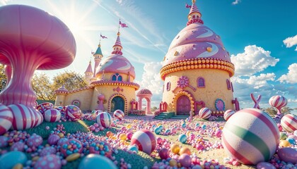 A vibrant and imaginative scene featuring colorful candy-like architectural structures in a dreamy pastel palette.