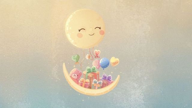 Smiling moon balloon floating over crescent cradle holding pastel gifts whimsical dream illustration