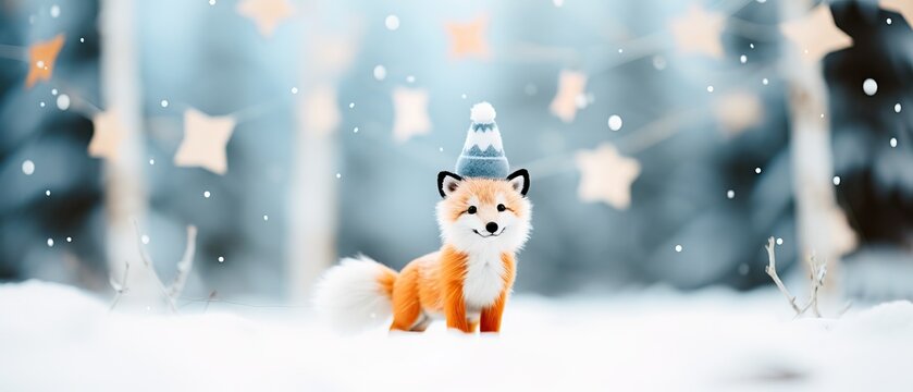 Cute fox wearing red holiday cloak holding holly in snowy whimsical winter scene