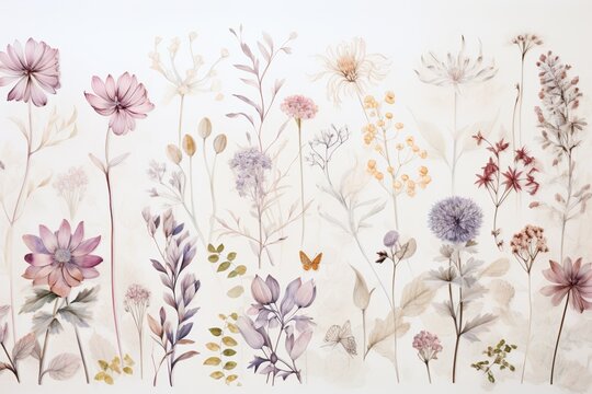 Whimsical floral wallpaper, vintage botanical prints, delicate fantasy elements, subtle watercolor finish, enchanting design