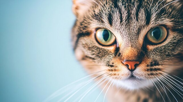 A close-up of an American cat's face, highlighting its unique fur patterns and whiskers against a light pastel background