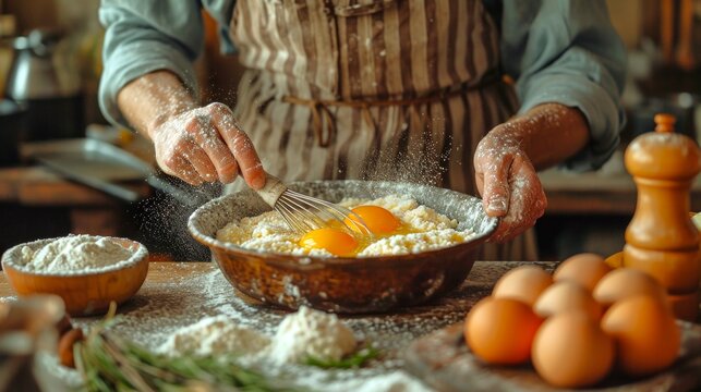 Hands whisking eggs with flour in a rustic kitchen setting. Concept of homemade cooking, baking ingredients preparation, rustic kitchen environment, and hands-on culinary activity.