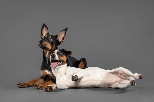 cute australian kelpie puppy dog and a jack russell terrier posing in the studio on a grey background
