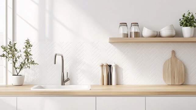 Modern white minimalistic kitchen interior details. Stylish white quartz countertop with kitchen sink with water tap, oranges and potted plant, window and wall cabinet