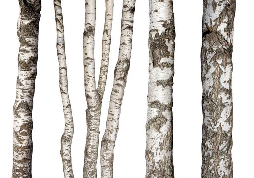 set of natural birch trunks isolated on white background