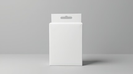 Close-up of white box with hang tab on gray backdrop, upright, soft light, minimal design, branding-ready focus