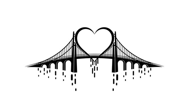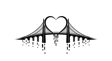 Black and white bridge with a heart shape in the middle and dripping design underneath it all silhouette