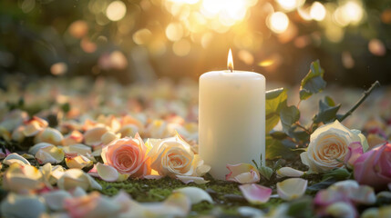 Funeral tribute with a white candle, roses, and scattered flower petals