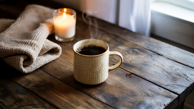 Dark coffee steaming in ceramic mug on rustic table. Knitted blanket and white candle nearby, soft window light highlights texture, calm scene with negative space, cozy home concept