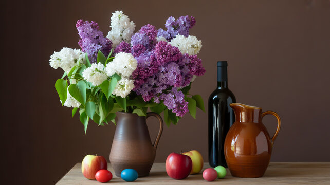 Purple and white lilacs in a ceramic jug with apples wine bottle and eggs still life purple flowers