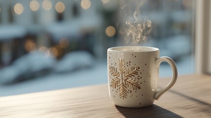 A steaming white mug with a snowflake design sits on a wooden table. Soft bokeh lights and snow-covered cars are visible in the background.