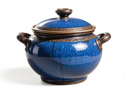 Modern ceramic pot with textured surface and green rim isolated on white background