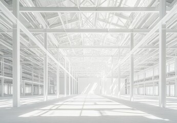 Revealing vast empty warehouse interior with steel columns, skylights, symmetrical trusses