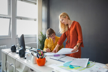 Team collaborating on data-driven presentation with woman pointing at document and laptop