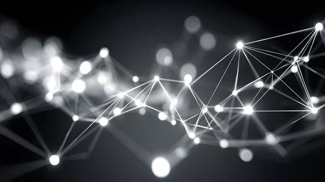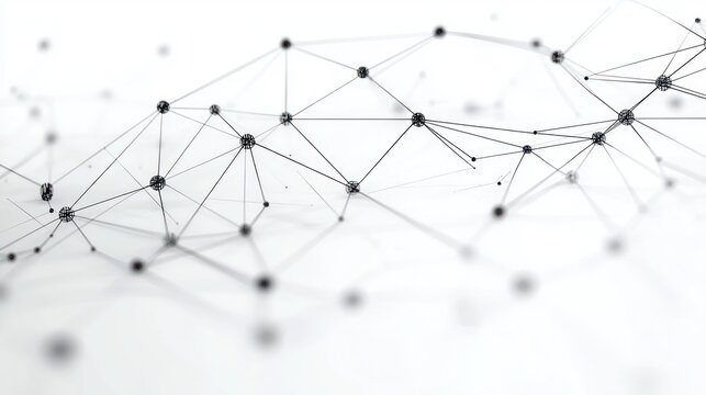 monochrome abstract network of black nodes connected by thin lines on a white background, minimal wireframe mesh with soft focus conveying calm futuristic connectivity