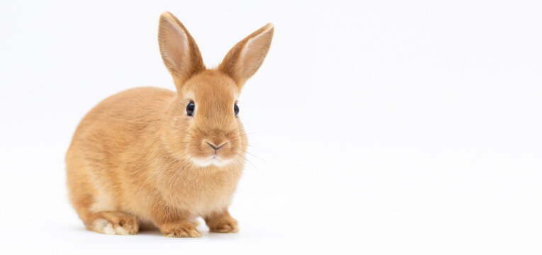 Rabbit on a white background, looking ahead, the breed of dwarf