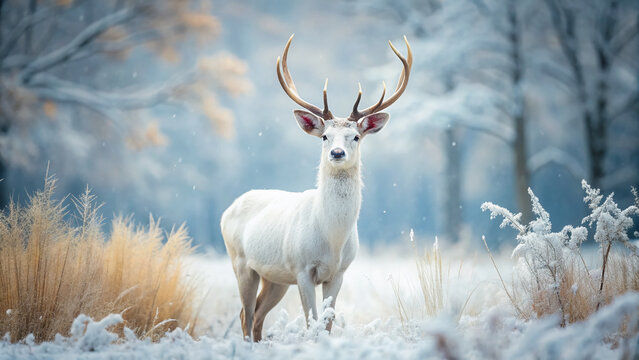A majestic white deer stands still in a serene snowy meadow, its coat blending seamlessly into the winter landscape, creating a stunning camouflage effect.