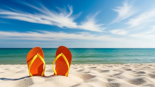 Bright orange and yellow flip flops on pristine white sandy beach with turquoise ocean and clear blue sky summer vacation concept