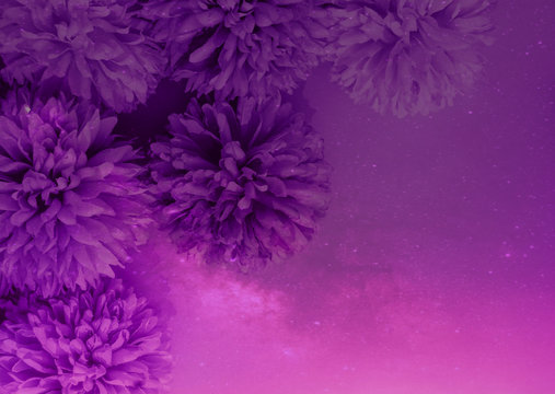 Beautiful abstract color purple and pink flowers on lightning background and white flower frame and purple leaves texture, white background, colorful flowers banner happy valentine