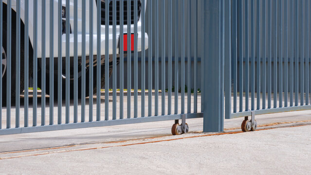 Perspective side view of sliding steel fence gate with white car parked inside of garage