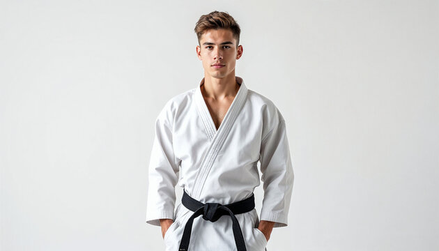 Sharp portrait of young American karate master in white gi and black belt.