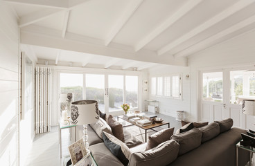 Sunny luxury home showcase living room with white wood beam vaulted ceiling