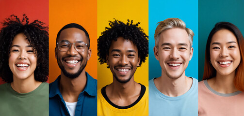 Collage of different people smiling, men and women from various age and race, multicultural. Diversity, inclusion, equality within one single grid of faces