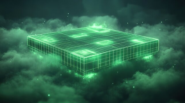 A surreal floating platform composed of layer upon layer of geometric glowing gridlines in bold green tones