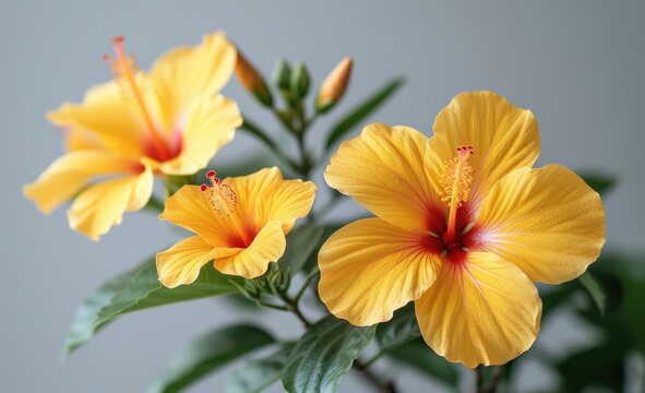 Vibrant pink hibiscus blossoms brightly against pure white background. AI Generated